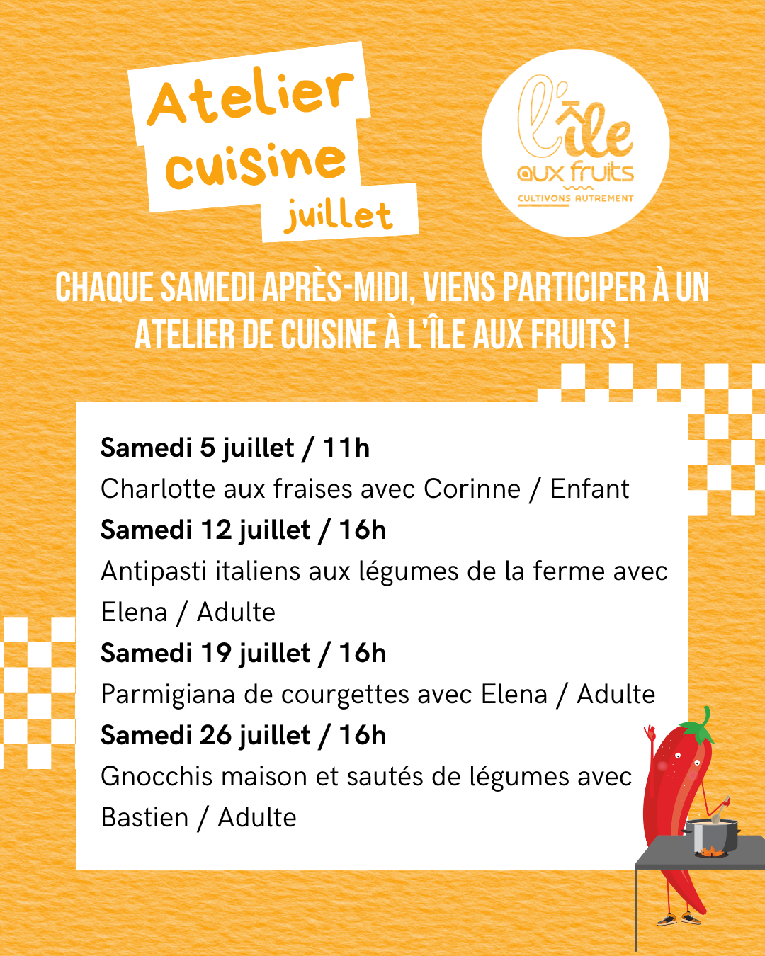 Le samedi à l’île aux fruits, pendant les beaux jours, c’est ouvert de 10h à 15h : tu peux venir prendre un bon café ou un petit déj’ en lisant le journal, les enfants peuvent faire une animation nature gratuite le matin, le midi on propose une nouvelle offre de restauration avec des frites, du poulet croustillant, des salades végétariennes, des pâtisseries…, et l’après-midi, c’est l’atelier cuisine !