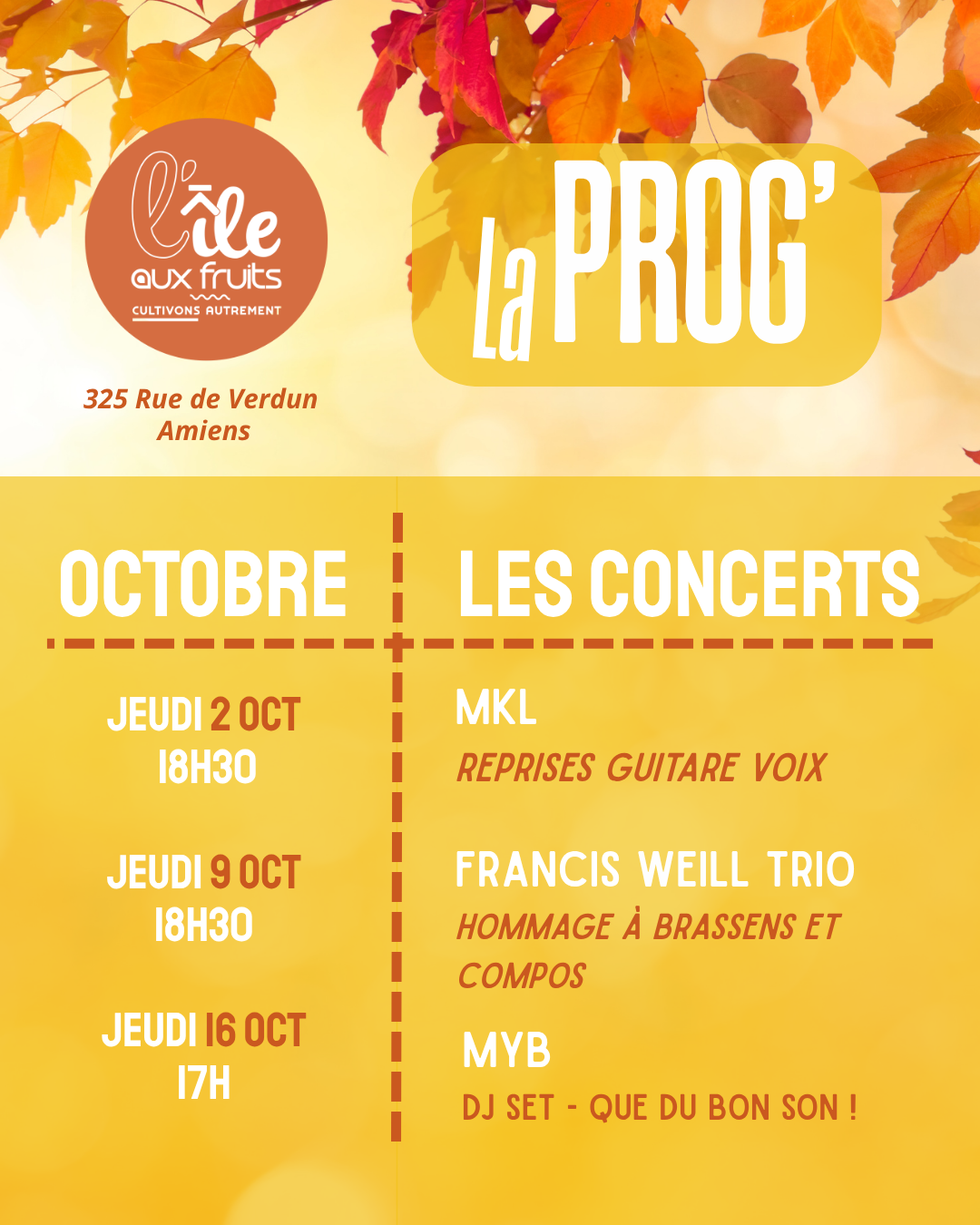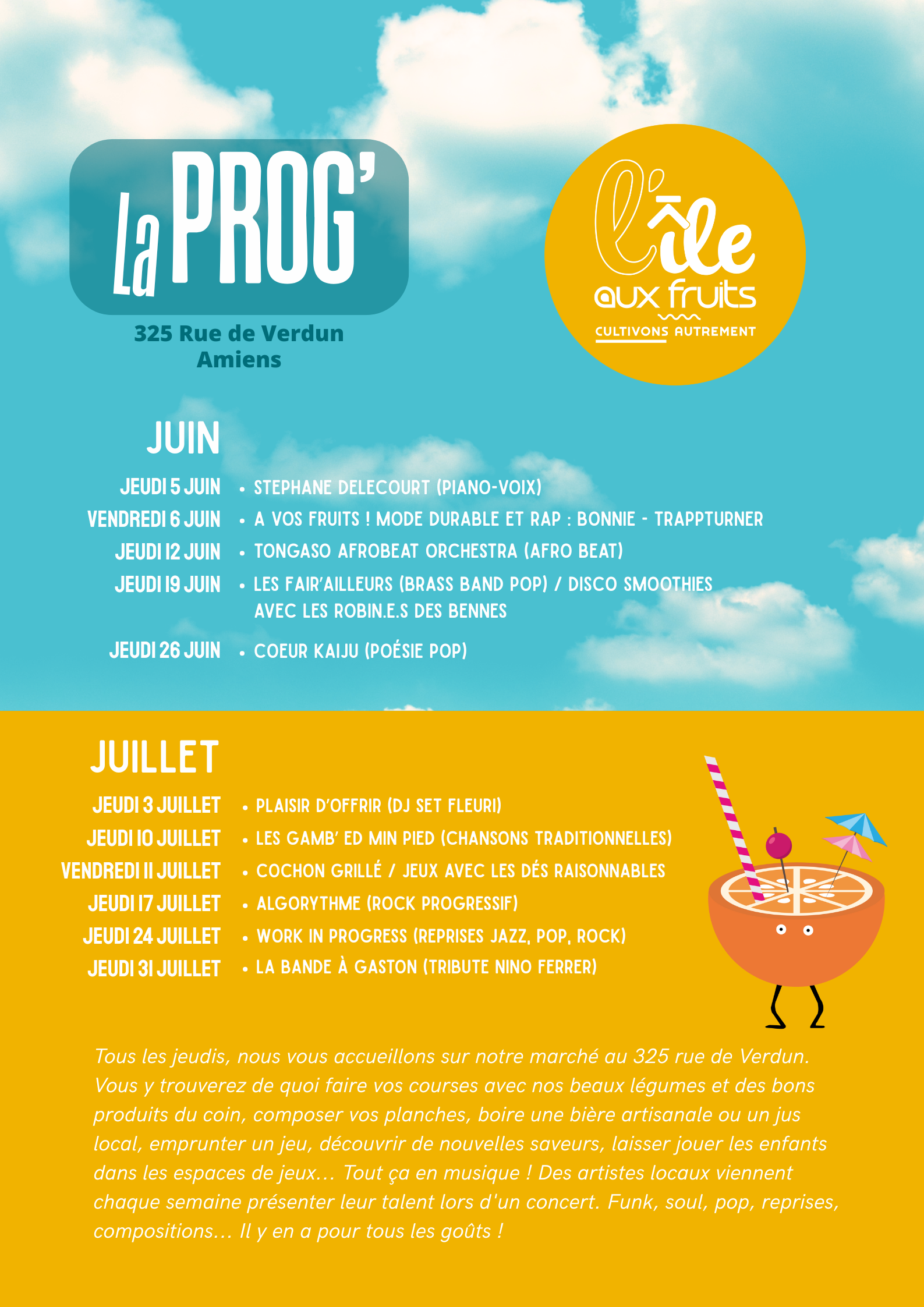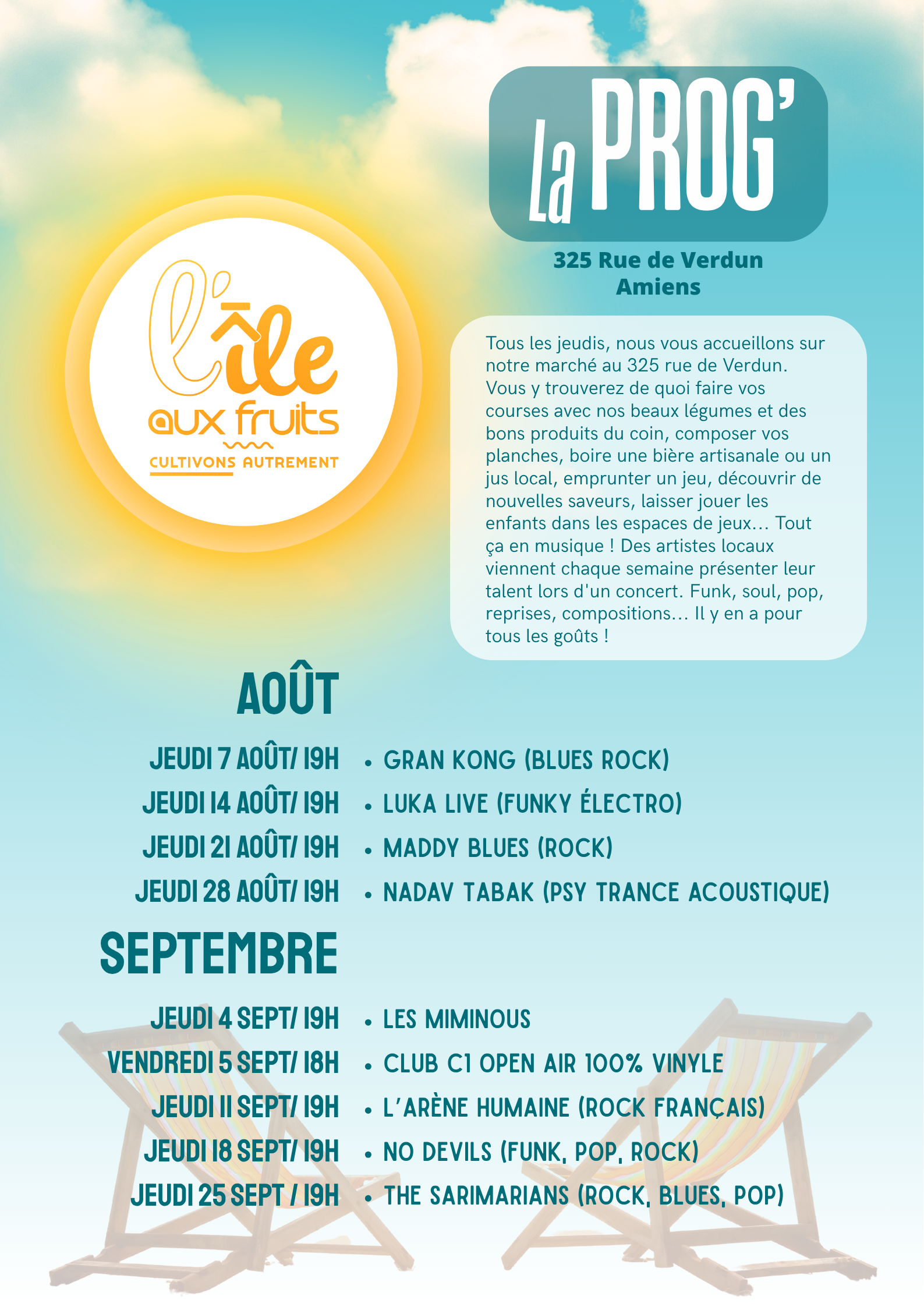 Retrouvez du beau monde sur la scène de l’île auxfruits, du rock, de la pop, des reprises et des compositions, chaque jeudi en août et en septembre. On vous donne également rendez-vous le vendredi 5 septembre pour un Open Air 100% vinyles avec le Club C1.